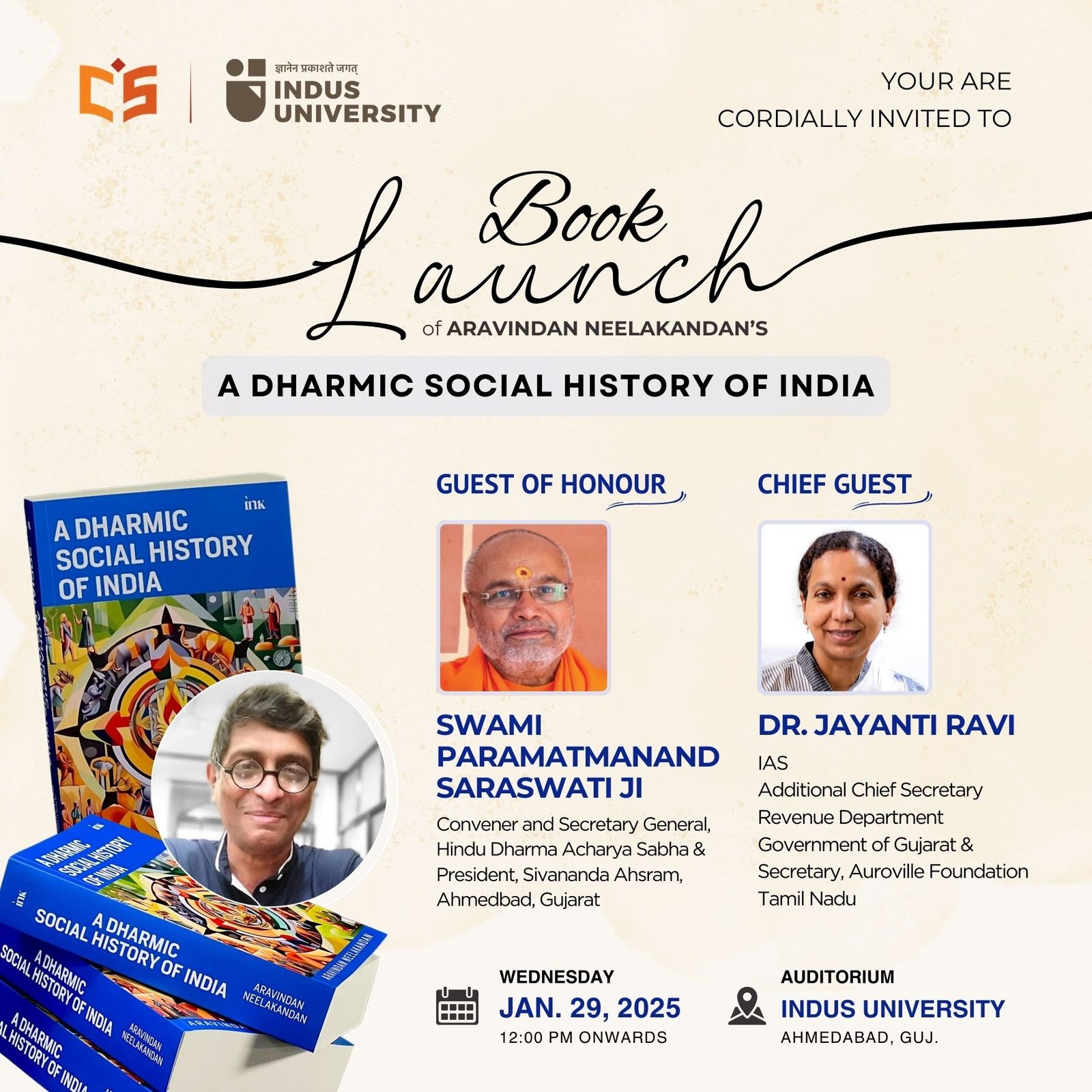 Book Launch of Aravindan Neelakandan's A Dharmic Social History of India in the presence of Guest of Honour: Swami Paramatmanand Saraswati Ji Chief Guest: Dr. Jayanti Ravi Patron: Dr. Nagesh Bhandari