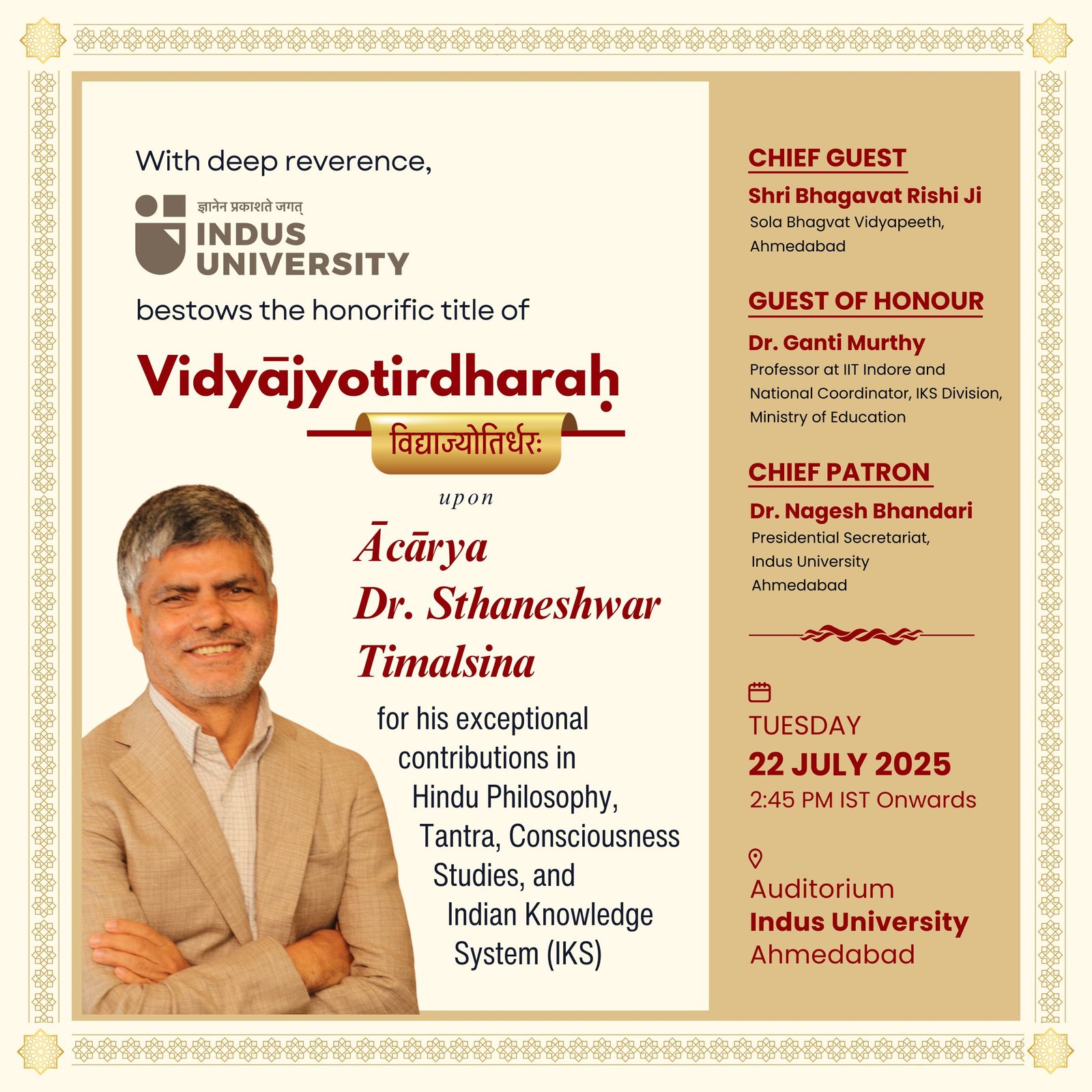 With deep reverence, Indus University bestows the honorific title of Vidyajyotirdharah upon Ä€cÄrya Dr. Sthaneshwar Timalsina for his exceptional contributions in Hindu Philosophy, Tantra, Consciousness Studies, and Indian Knowledge System (IKS).