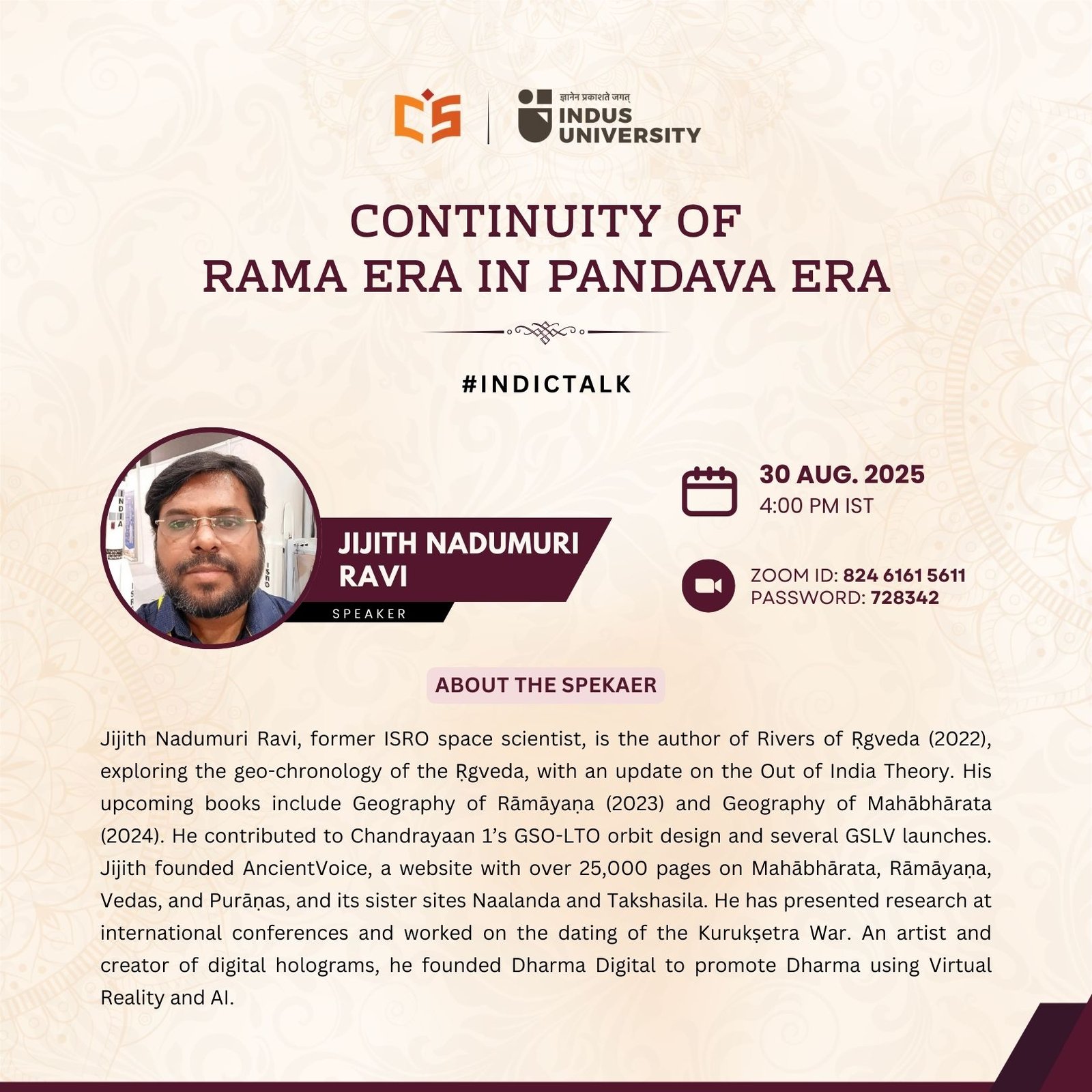 Jijith Nadumuri Ravi, former space scientist with ISRO, is the author of the book Rivers of Ṛgveda (January 2022), focusing on the geo-chronology of Ṛgveda, with an update on Out of India Theory. His subsequent books include "Geography of RÄmÄyaṇa" (Jan 2023) and "Geography of Mahabharata" (Jan 2024). At ISRO he contributed to the Chandrayan 1 GSO-LTO orbit design, and the GSLV launches D2, F01, and F02. He founded AncientVoice (ancientvoice.wikidot.com), hosting extensive resources on MahÄbhÄrata, RÄmÄyaṇa, Vedas, and PurÄṇas, with sister sites Naalanda and Takshasila. Jijith is a speaker at international conferences, presenting research papers on MahÄbhÄrata Geography. He actively aided in dating the Kuruká¹£etra War.